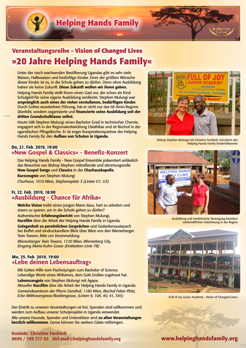 Heute hält Stephen Mulungi einen Bachelor-Grad in technischer Chemie, engagiert sich in der Regionalentwicklung Ostafrikas und ist Bischof in der ugandischen Pfingstkirche. Er ist enger Kooperationspartner der Helping Hands Family für den Aufbau von Schulen in Uganda.